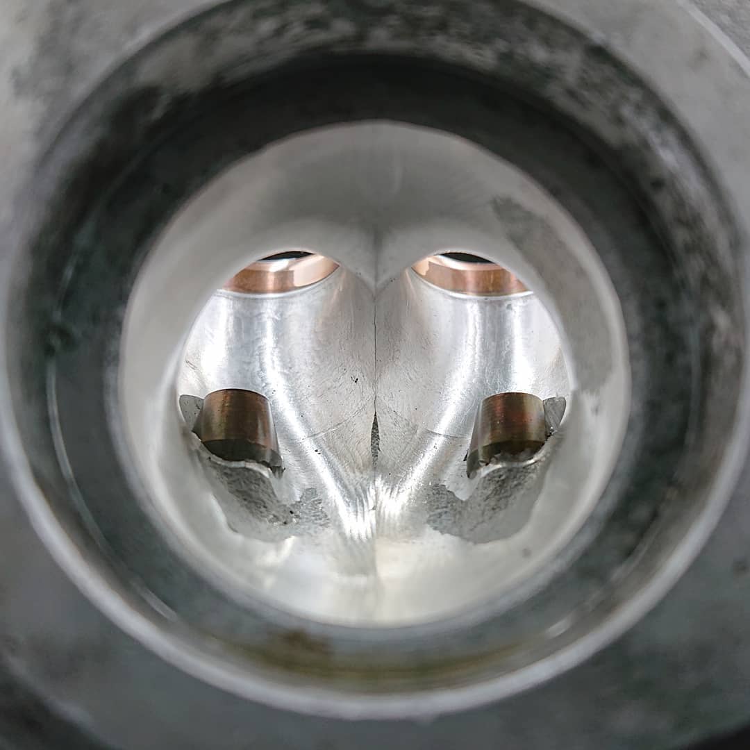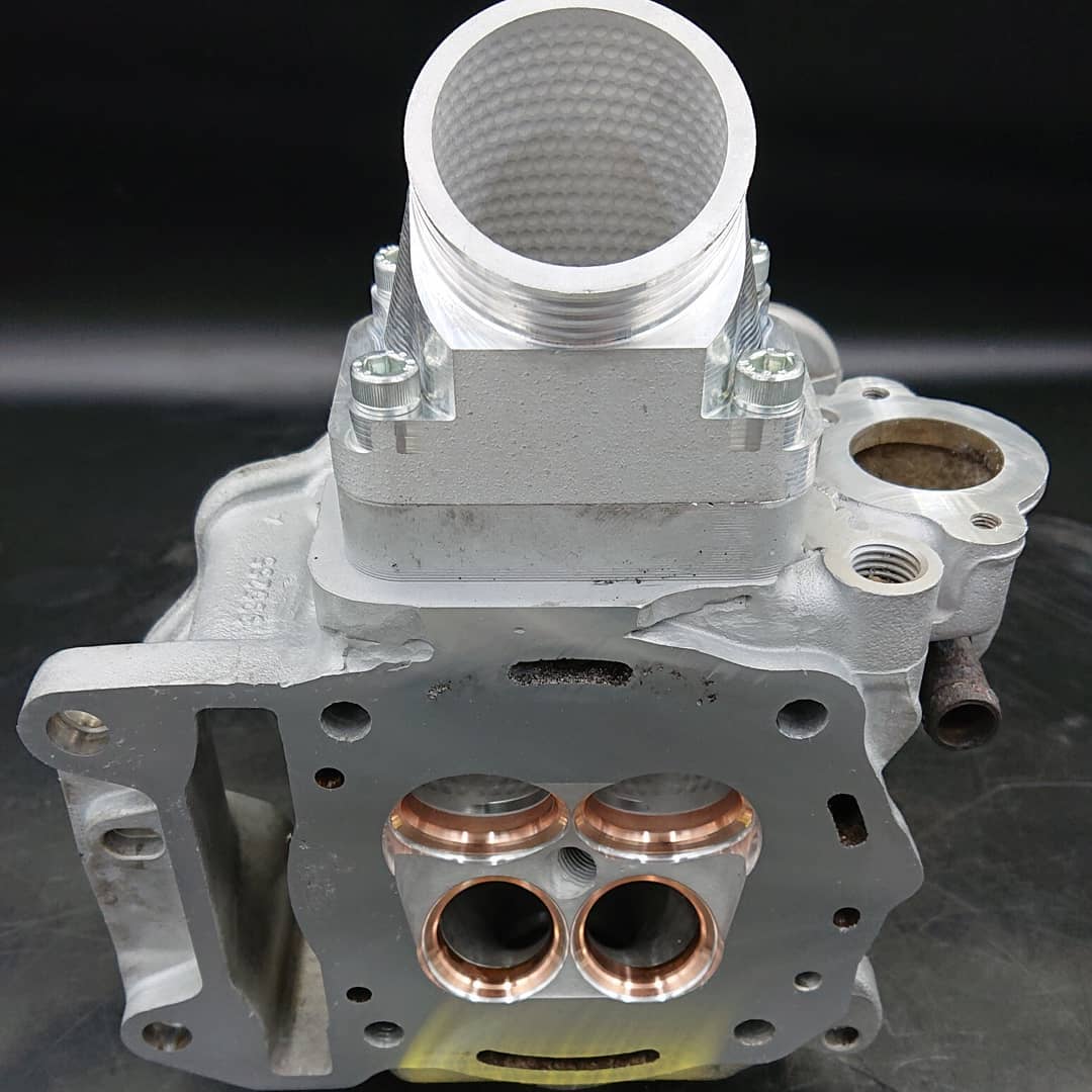 The Piaggio head has the intake manifold cast directly on the head at a very sharp angle. This greatly inhibits performance, so AaSa was called to change that!! We sawed off the old manifold, welded a seat for the new one and built a new billet manifold from scratch!
